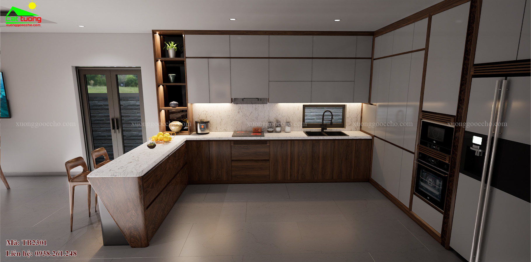 Thiết kế và thi công phòng bếp gỗ óc chó theo kích thước thực tế. Liên hệ Cát Tường để được tư vấn miễn phí!!!