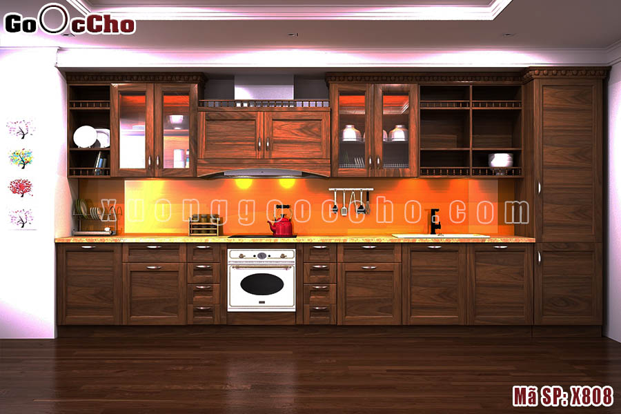 Thiết kế tủ bếp gỗ óc chó X808 được Cát Tường thiết kế thích hợp cho nhà chật, kiểu dáng tủ bếp chữ I cũng đang được nhiều nhà sử dụng.