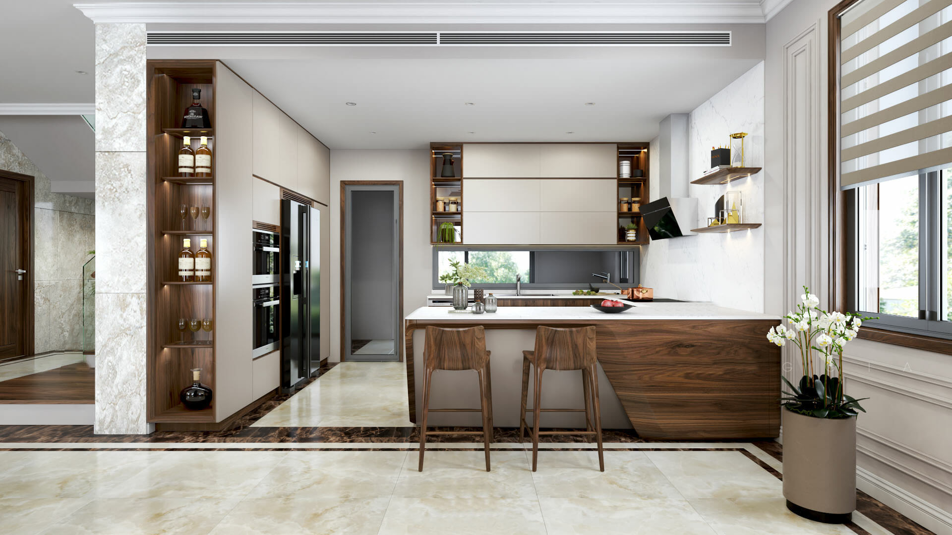 Phòng ăn là không gian hoàn hảo để lắp đặt vách ốp kính thủy lớn vì ăn uống đại diện cho sự giàu có, no đủ của gia đình.