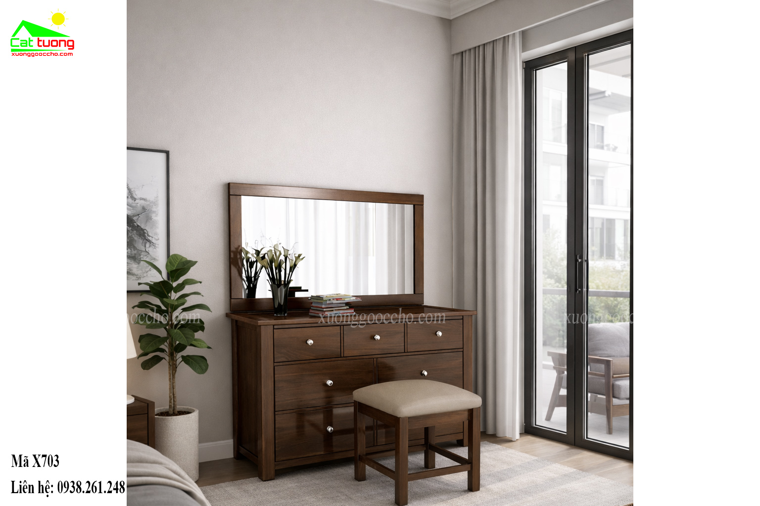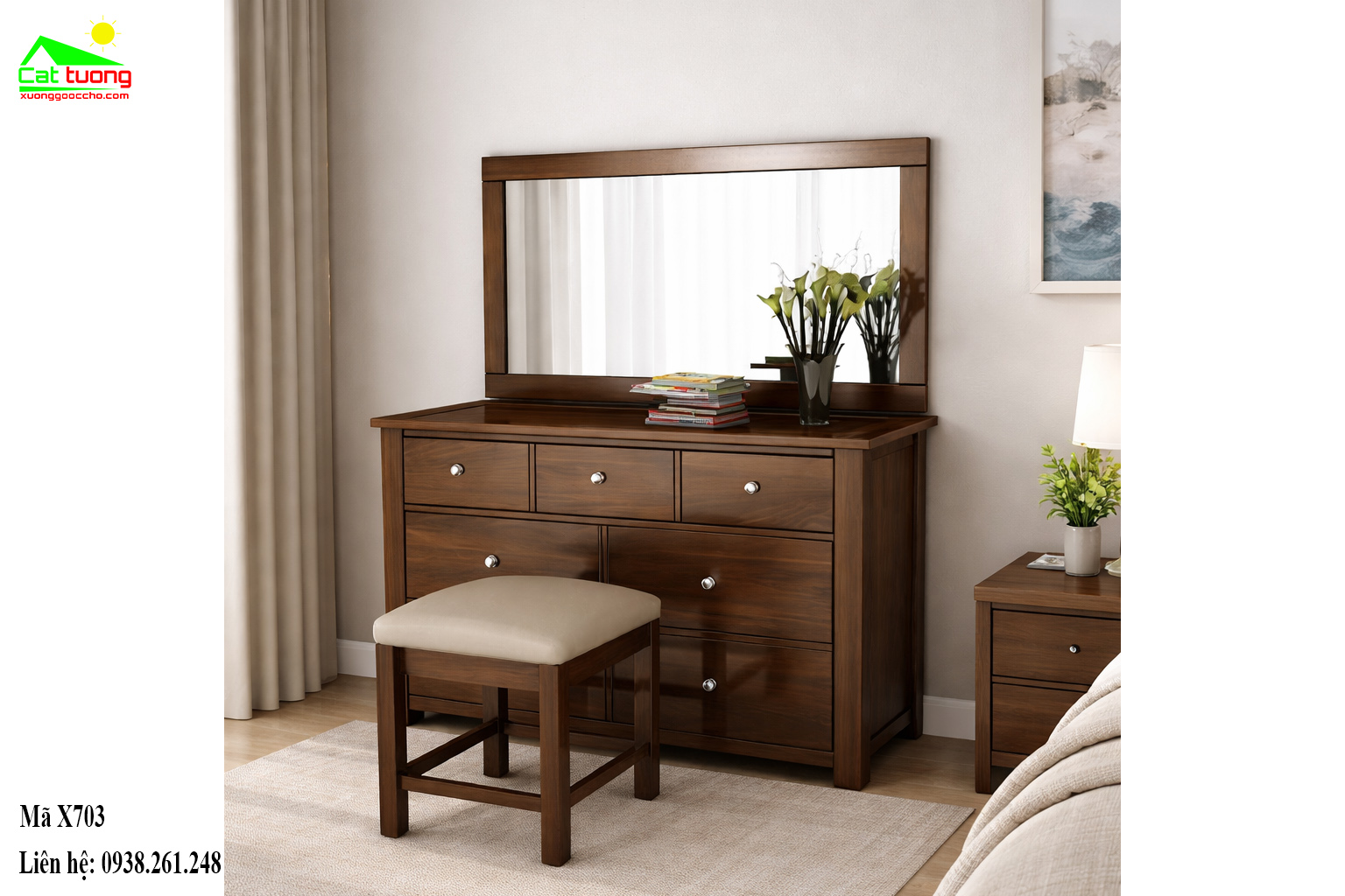 Mỗi thiết kế bàn trang điểm của Nội thất Cát Tường đều phải đảm bảo những tiêu chuẩn khắt khe về mẫu mã, kích thước nhỏ gọn và quan trọng hơn cả đó chính là công năng sử dụng phải thuận tiện. Mẫu bàn trang điểm gỗ Óc Chó X703 là một trong số đó.